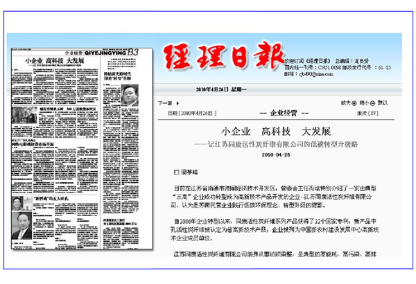 經(jīng)理日報(bào)——小企業(yè)、高科技、大發(fā)展“記江蘇同康活性碳纖維有限公司的低碳轉(zhuǎn)型升級路”
