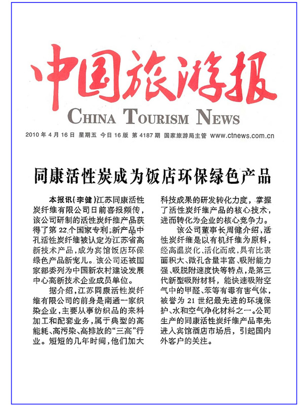 中國旅游報——同康活性碳成為飯店環(huán)保綠色產(chǎn)品